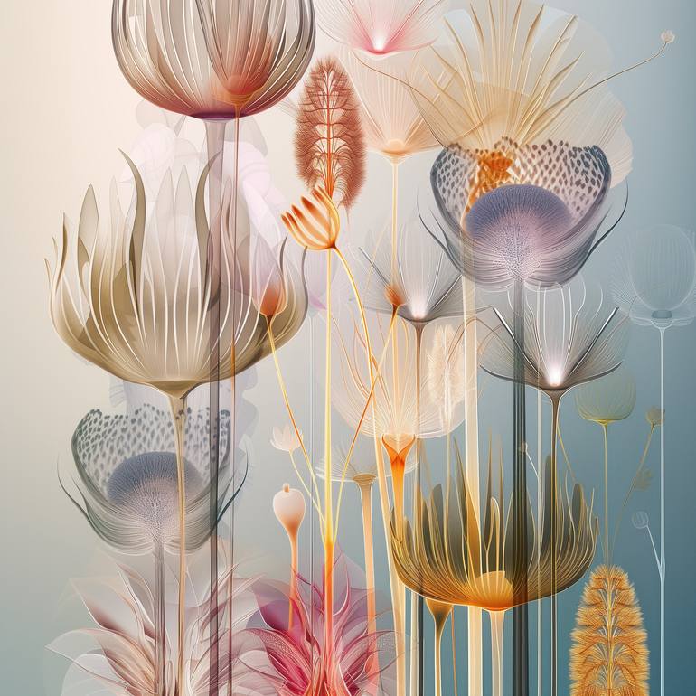 The elegant flowers blooming in these digital artworks are the result of my imagination meeting the astonishing possibilities of generative artificial intelligence. My vision was to portray floral vegetation in a highly digital style, reminiscent of 3D architectural technical drawings, particularly...